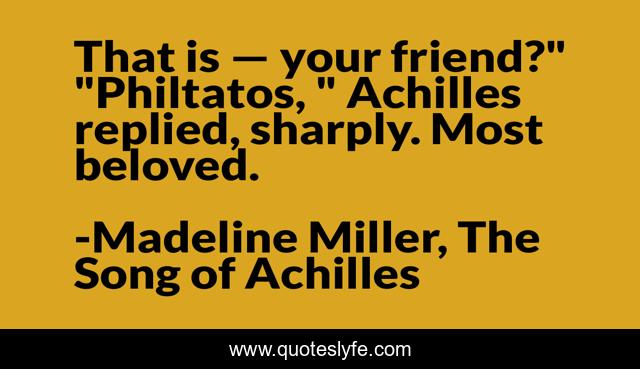 This page presents the quote "That is — your friend?" "Philtatos, " Achilles replied, sharply. Most beloved.". Author of this quote is Madeline Miller, The Song of Achilles. This quote is about death, love, patroclus, lgbt, lgbtq, trojan-war, greek, death-of-a-loved-one, achilles,.