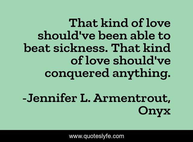This page presents the quote "That kind of love should've been able to beat sickness. That kind of love should've conquered anything.". Author of this quote is Jennifer L. Armentrout, Onyx. This quote is about love, jennifer-l-armentrout, onyx, affection,.