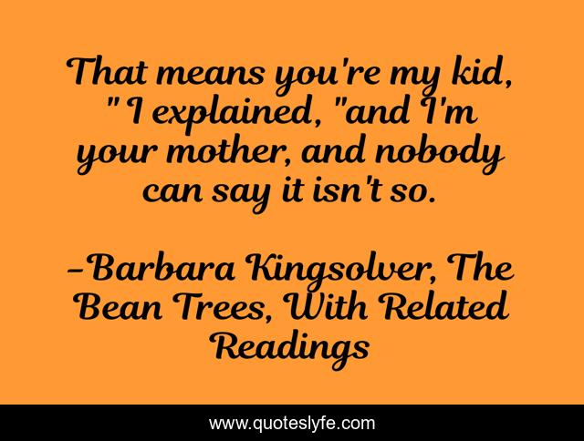 "Barbara Kingsolver, The Bean Trees, With Related Readings Quotes." Quoteslyfe.com, 2025. Sun. 07 Dec. 2025. <https://www.quoteslyfe.com/quote/That-means-you-re-my-kid-I-213207>.