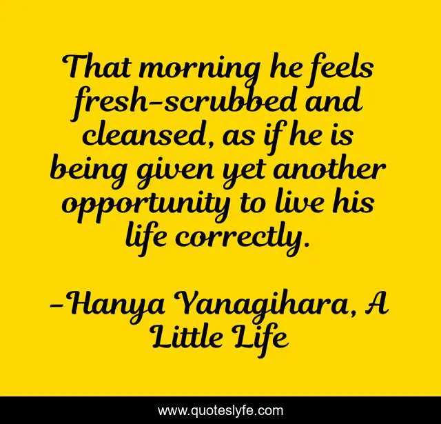 This page presents the quote "That morning he feels fresh-scrubbed and cleansed, as if he is being given yet another opportunity to live his life correctly.". Author of this quote is Hanya Yanagihara, A Little Life. This quote is about fresh-start, a-little-life, opportunity, hanya-yanagihara,.