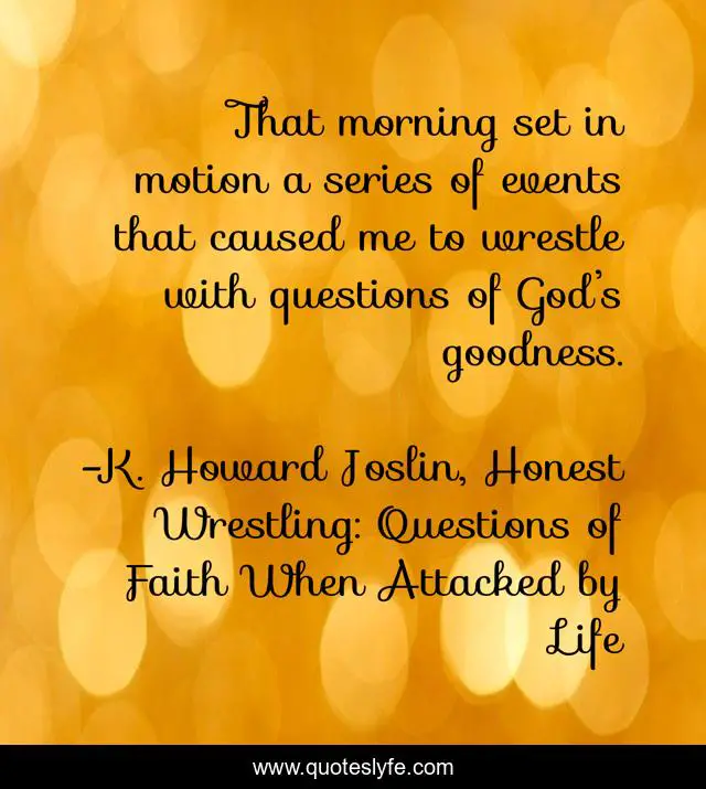 This page presents the quote "That morning set in motion a series of events that caused me to wrestle with questions of God’s goodness.". Author of this quote is K. Howard Joslin, Honest Wrestling: Questions of Faith When Attacked by Life. This quote is about trials, suffering, god-s-goodness, fatih,.