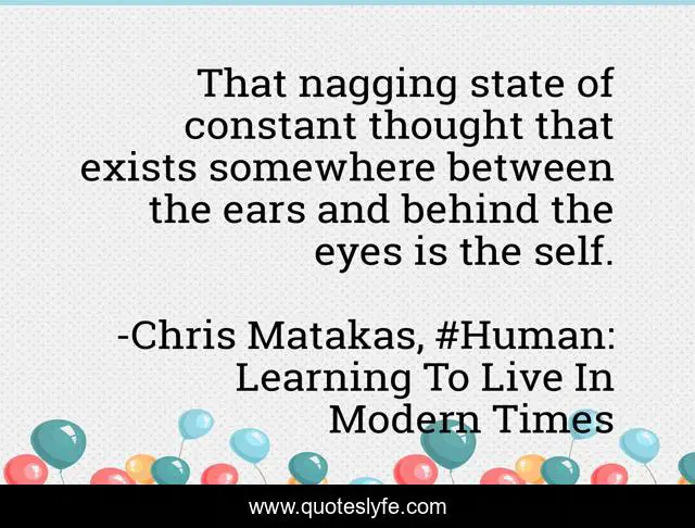 This page presents the quote "That nagging state of constant thought that exists somewhere between the ears and behind the eyes is the self.". Author of this quote is Chris Matakas, #Human: Learning To Live In Modern Times. This quote is about spirituality, buddhism, the-self, identity,.