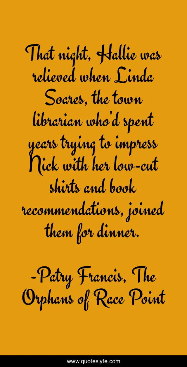 This page presents the quote "That night, Hallie was relieved when Linda Soares, the town librarian who'd spent years trying to impress Nick with her low-cut shirts and book recommendations, joined them for dinner.". Author of this quote is Patry Francis, The Orphans of Race Point. This quote is about librarians, dating,.