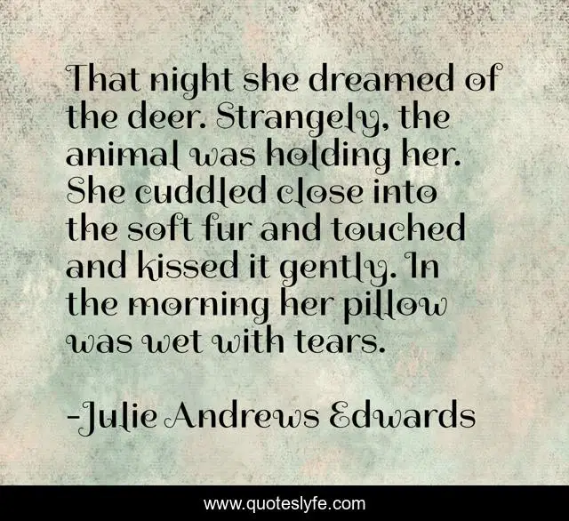 This page presents the quote "That night she dreamed of the deer. Strangely, the animal was holding her. She cuddled close into the soft fur and touched and kissed it gently. In the morning her pillow was wet with tears.". Author of this quote is Julie Andrews Edwards. This quote is about love, needing, deer, sadness, inspirational, enthusiasm, affection,.
