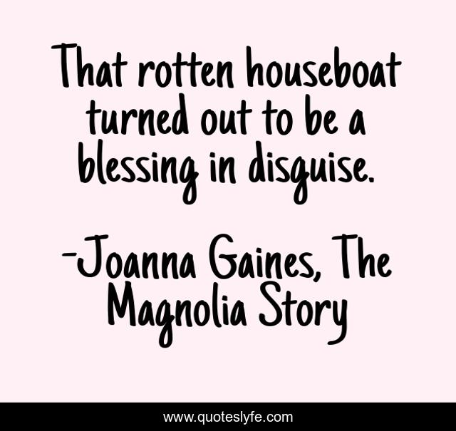 This page presents the quote "That rotten houseboat turned out to be a blessing in disguise.". Author of this quote is Joanna Gaines, The Magnolia Story. This quote is about blessings, houseboat,.