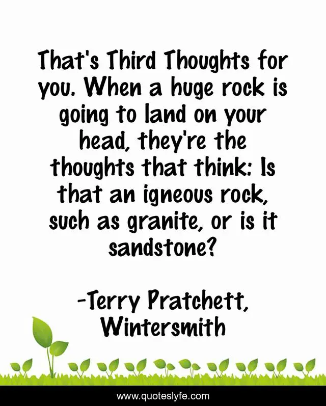 This page presents the quote "That's Third Thoughts for you. When a huge rock is going to land on your head, they're the thoughts that think: Is that an igneous rock, such as granite, or is it sandstone?". Author of this quote is Terry Pratchett, Wintersmith. This quote is about perspicacity, curiosity, geology, science, tiffany-aching, imagination, witches, humor,.