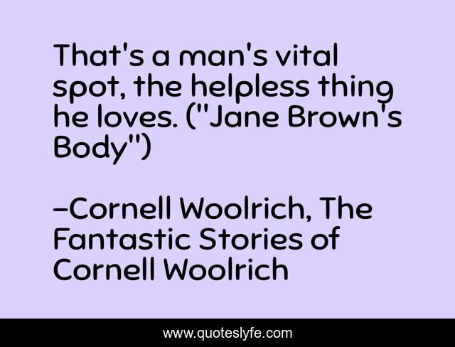 This page presents the quote "That's a man's vital spot, the helpless thing he loves. ("Jane Brown's Body")". Author of this quote is Cornell Woolrich, The Fantastic Stories of Cornell Woolrich. This quote is about weakness, men, love, affection, man,.
