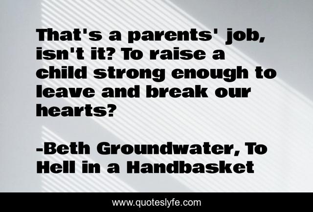 This page presents the quote "That's a parents' job, isn't it? To raise a child strong enough to leave and break our hearts?". Author of this quote is Beth Groundwater, To Hell in a Handbasket. .