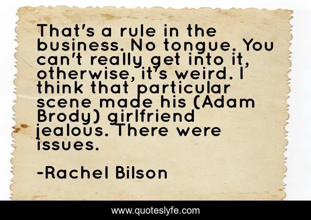 This page presents the quote "That's a rule in the business. No tongue. You can't really get into it, otherwise, it's weird. I think that particular scene made his (Adam Brody) girlfriend jealous. There were issues.". Author of this quote is Rachel Bilson. This quote is about jealous, weird, think,.