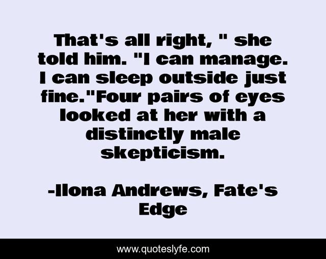 This page presents the quote "That's all right, " she told him. "I can manage. I can sleep outside just fine."Four pairs of eyes looked at her with a distinctly male skepticism.". Author of this quote is Ilona Andrews, Fate's Edge. This quote is about funny, fate-s-edge, gaston, the-edge, ilona-andrews, male-skepticism, audrey, jack, kaldar,.