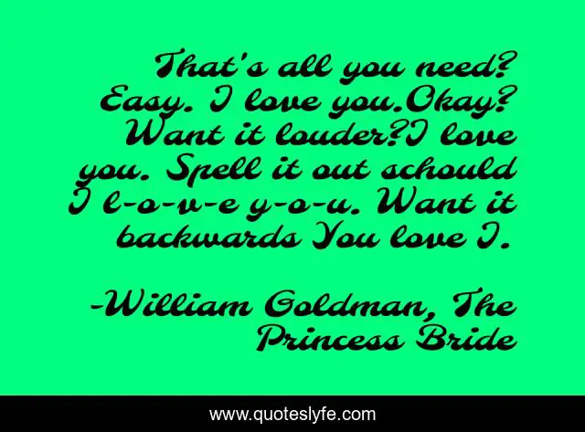 This page presents the quote "That's all you need? Easy. I love you.Okay? Want it louder?I love you. Spell it out schould I l-o-v-e y-o-u. Want it backwards You love I.". Author of this quote is William Goldman, The Princess Bride. .