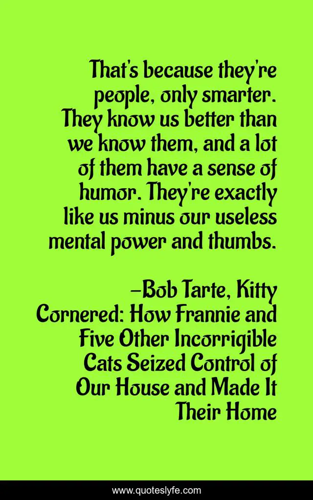 This page presents the quote "That's because they're people, only smarter. They know us better than we know them, and a lot of them have a sense of humor. They're exactly like us minus our useless mental power and thumbs.". Author of this quote is Bob Tarte, Kitty Cornered: How Frannie and Five Other Incorrigible Cats Seized Control of Our House and Made It Their Home. .