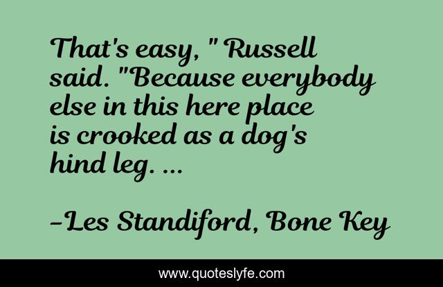 This page presents the quote "That's easy, " Russell said. "Because everybody else in this here place is crooked as a dog's hind leg. ...". Author of this quote is Les Standiford, Bone Key. This quote is about funny, comedy, quip,.