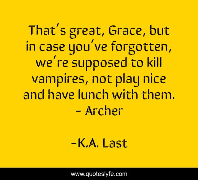 This page presents the quote "That’s great, Grace, but in case you’ve forgotten, we’re supposed to kill vampires, not play nice and have lunch with them. - Archer". Author of this quote is K.A. Last. This quote is about vampires, humour,.