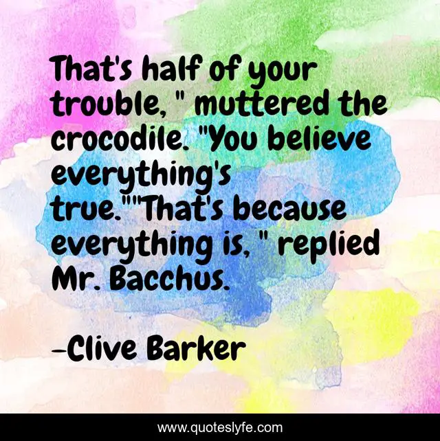 This page presents the quote "That's half of your trouble, " muttered the crocodile. "You believe everything's true.""That's because everything is, " replied Mr. Bacchus.". Author of this quote is Clive Barker. This quote is about bacchus, clive-barker, truth, fantasy,.