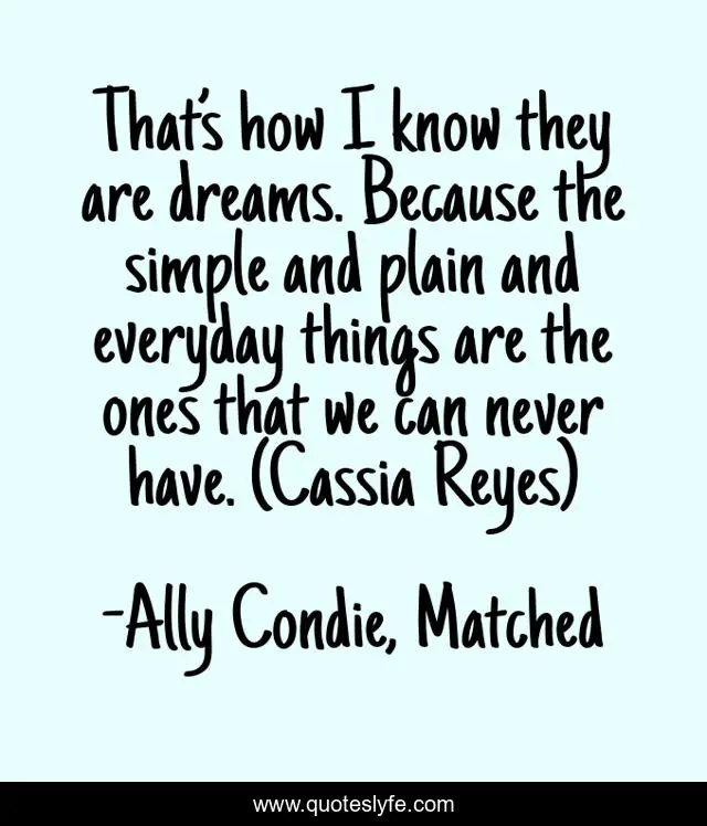This page presents the quote "That’s how I know they are dreams. Because the simple and plain and everyday things are the ones that we can never have. (Cassia Reyes)". Author of this quote is Ally Condie, Matched. This quote is about life, dream, reality,.