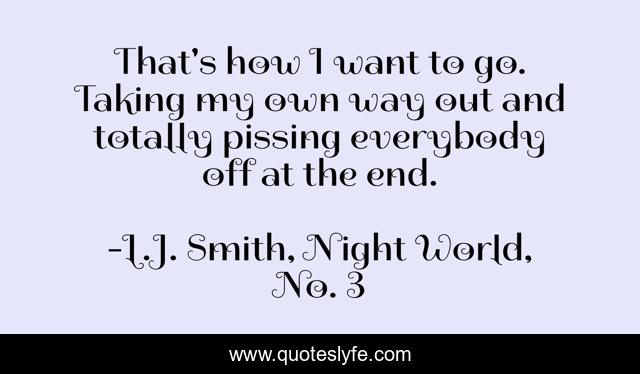 This page presents the quote "That's how I want to go. Taking my own way out and totally pissing everybody off at the end.". Author of this quote is L.J. Smith, Night World, No. 3. This quote is about death, humor,.