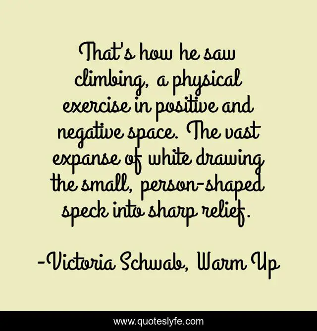 This page presents the quote "That's how he saw climbing, a physical exercise in positive and negative space. The vast expanse of white drawing the small, person-shaped speck into sharp relief.". Author of this quote is Victoria Schwab, Warm Up. This quote is about climbing, positive-space, negative-space, space,.