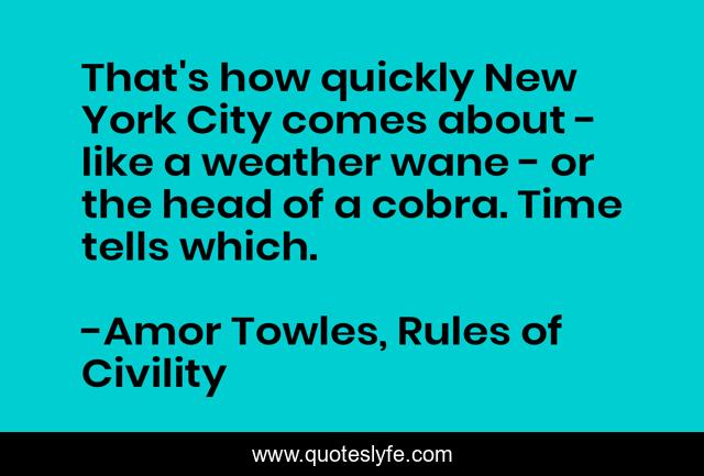 This page presents the quote "That's how quickly New York City comes about - like a weather wane - or the head of a cobra. Time tells which.". Author of this quote is Amor Towles, Rules of Civility. This quote is about nyc, new-york-city,.