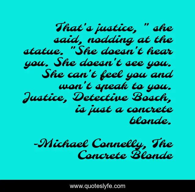 This page presents the quote "That's justice, " she said, nodding at the statue. "She doesn't hear you. She doesn't see you. She can't feel you and won't speak to you. Justice, Detective Bosch, is just a concrete blonde.". Author of this quote is Michael Connelly, The Concrete Blonde. This quote is about justice, harry-bosch,.