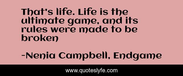 This page presents the quote "That's life. Life is the ultimate game, and its rules were made to be broken". Author of this quote is Nenia Campbell, Endgame. This quote is about rules, life, games, life-lessons,.