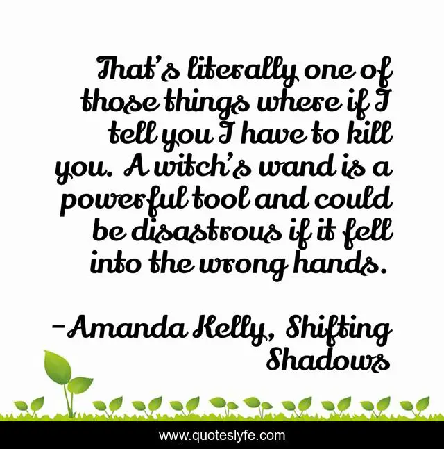 This page presents the quote "That’s literally one of those things where if I tell you I have to kill you. A witch’s wand is a powerful tool and could be disastrous if it fell into the wrong hands.". Author of this quote is Amanda Kelly, Shifting Shadows. This quote is about secrets, wands, witches,.