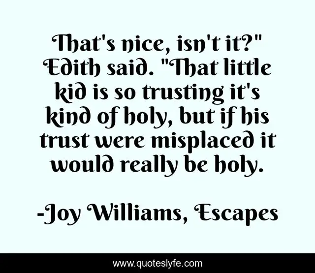 This page presents the quote "That's nice, isn't it?" Edith said. "That little kid is so trusting it's kind of holy, but if his trust were misplaced it would really be holy.". Author of this quote is Joy Williams, Escapes. This quote is about trust, holiness,.