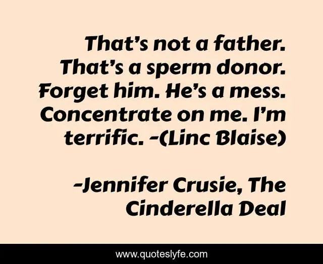 This page presents the quote "That’s not a father. That’s a sperm donor. Forget him. He’s a mess. Concentrate on me. I’m terrific. -(Linc Blaise)". Author of this quote is Jennifer Crusie, The Cinderella Deal. This quote is about mine, lover,.