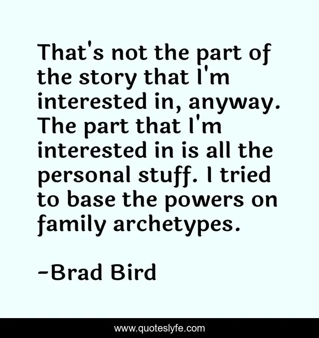 This page presents the quote "That's not the part of the story that I'm interested in, anyway. The part that I'm interested in is all the personal stuff. I tried to base the powers on family archetypes.". Author of this quote is Brad Bird. This quote is about personal, story, part,.