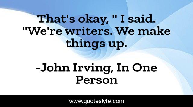 This page presents the quote "That's okay, " I said. "We're writers. We make things up.". Author of this quote is John Irving, In One Person. .