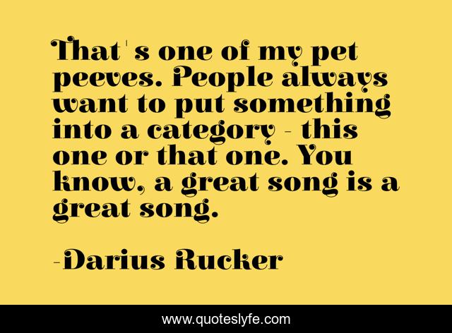 This page presents the quote "That's one of my pet peeves. People always want to put something into a category - this one or that one. You know, a great song is a great song.". Author of this quote is Darius Rucker. This quote is about great, song, people,.