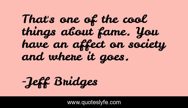This page presents the quote "That's one of the cool things about fame. You have an affect on society and where it goes.". Author of this quote is Jeff Bridges. This quote is about society, fame,.
