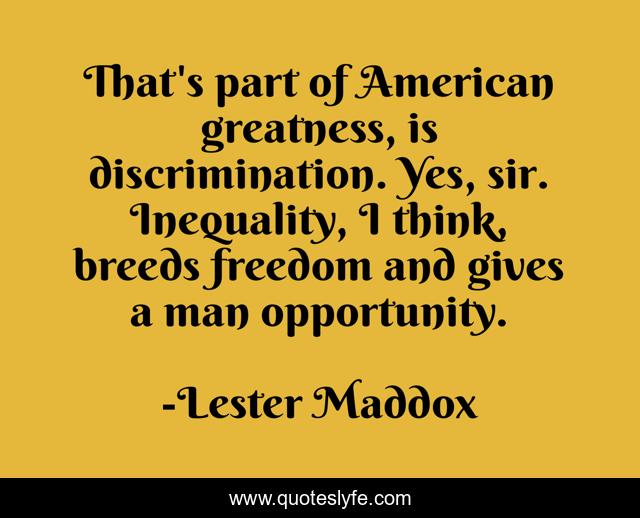This page presents the quote "That's part of American greatness, is discrimination. Yes, sir. Inequality, I think, breeds freedom and gives a man opportunity.". Author of this quote is Lester Maddox. This quote is about american, opportunity, man,.