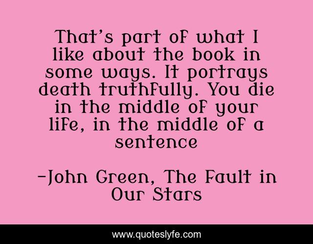This page presents the quote "That’s part of what I like about the book in some ways. It portrays death truthfully. You die in the middle of your life, in the middle of a sentence". Author of this quote is John Green, The Fault in Our Stars. .