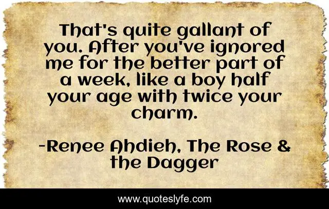 This page presents the quote "That's quite gallant of you. After you've ignored me for the better part of a week, like a boy half your age with twice your charm.". Author of this quote is Renee Ahdieh, The Rose & the Dagger. This quote is about shazi, sarcasm,.