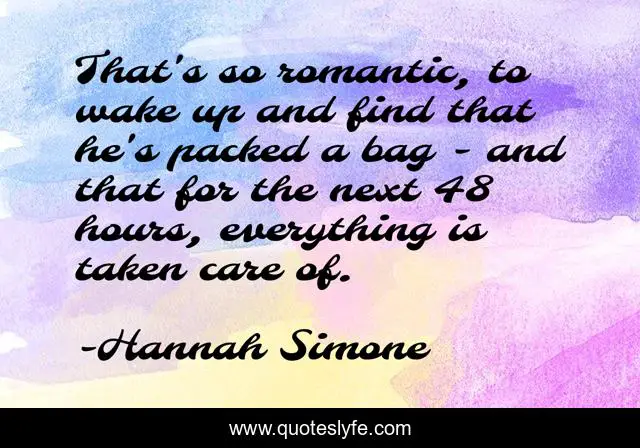 This page presents the quote "That's so romantic, to wake up and find that he's packed a bag - and that for the next 48 hours, everything is taken care of.". Author of this quote is Hannah Simone. This quote is about wake up, bag, care,.