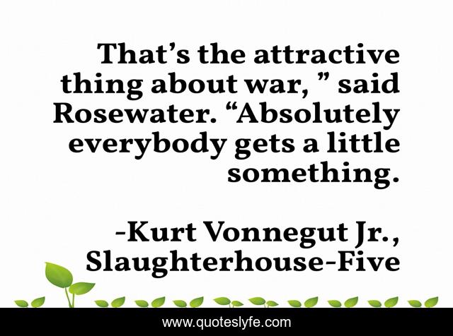 This page presents the quote "That’s the attractive thing about war, ” said Rosewater. “Absolutely everybody gets a little something.". Author of this quote is Kurt Vonnegut Jr., Slaughterhouse-Five. This quote is about attractive, beauty, war,.
