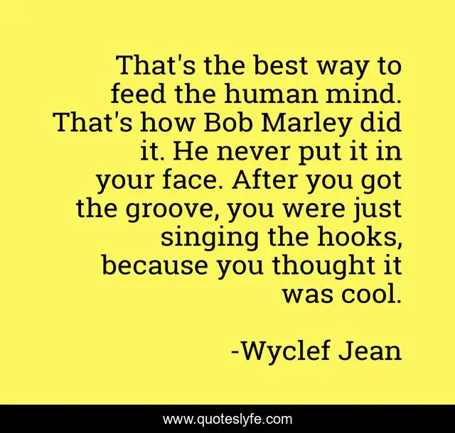 This page presents the quote "That's the best way to feed the human mind. That's how Bob Marley did it. He never put it in your face. After you got the groove, you were just singing the hooks, because you thought it was cool.". Author of this quote is Wyclef Jean. This quote is about thought, mind, best,.