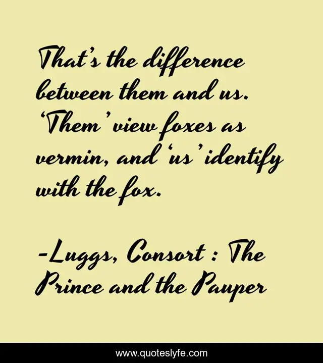 This page presents the quote "That’s the difference between them and us. ‘Them’ view foxes as vermin, and ‘us’ identify with the fox.". Author of this quote is Luggs, Consort : The Prince and the Pauper. This quote is about fox-hunting, vermin, prejudice, class,.