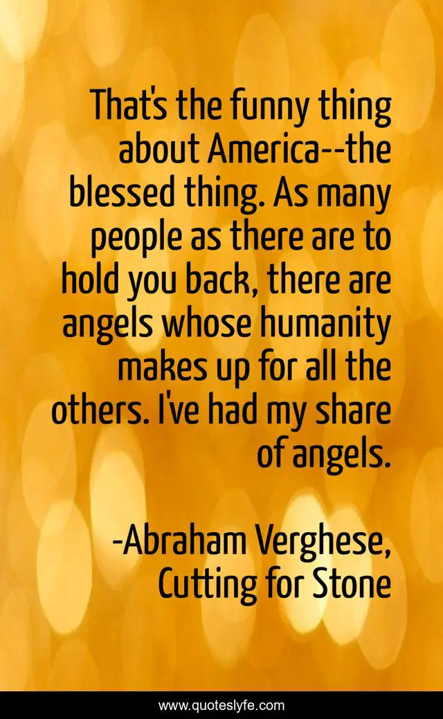 This page presents the quote "That's the funny thing about America--the blessed thing. As many people as there are to hold you back, there are angels whose humanity makes up for all the others. I've had my share of angels.". Author of this quote is Abraham Verghese, Cutting for Stone. .