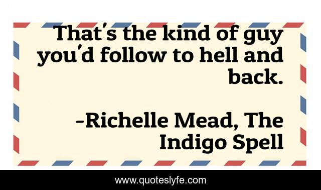 This page presents the quote "That's the kind of guy you'd follow to hell and back.". Author of this quote is Richelle Mead, The Indigo Spell. This quote is about attraction, marcus-finch,.