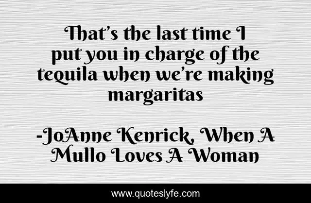 This page presents the quote "That’s the last time I put you in charge of the tequila when we’re making margaritas". Author of this quote is JoAnne Kenrick, When A Mullo Loves A Woman. This quote is about mystery, pearl-kizzy, margaritas, vampires, mullo, vampire, paranormal, romance, gypsy,.