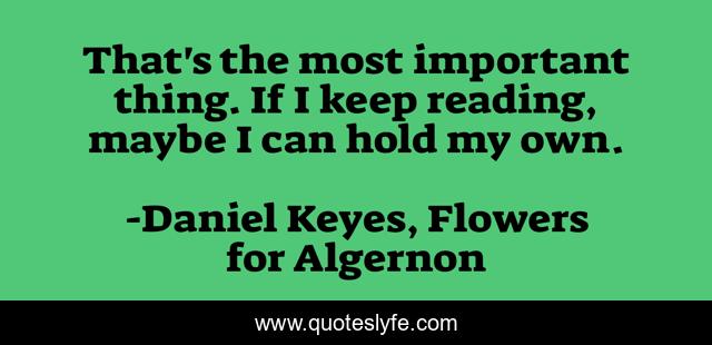 This page presents the quote "That's the most important thing. If I keep reading, maybe I can hold my own.". Author of this quote is Daniel Keyes, Flowers for Algernon. This quote is about literature, read, bookish, book, reader, reading,.