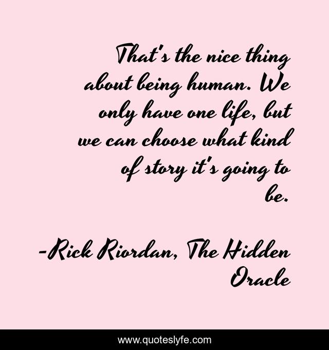 This page presents the quote "That's the nice thing about being human. We only have one life, but we can choose what kind of story it's going to be.". Author of this quote is Rick Riordan, The Hidden Oracle. This quote is about individuality, unique, life-story, choosing, choices,.