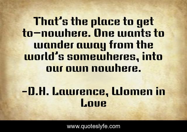 This page presents the quote "That’s the place to get to—nowhere. One wants to wander away from the world’s somewheres, into our own nowhere.". Author of this quote is D.H. Lawrence, Women in Love. This quote is about wanderlust, travel, wandering, nowhere,.
