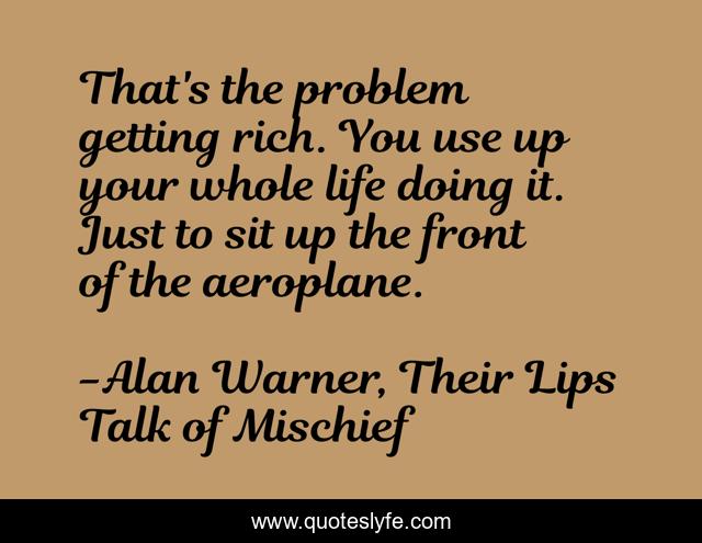 This page presents the quote "That's the problem getting rich. You use up your whole life doing it. Just to sit up the front of the aeroplane.". Author of this quote is Alan Warner, Their Lips Talk of Mischief. This quote is about wealth, getting-rich,.