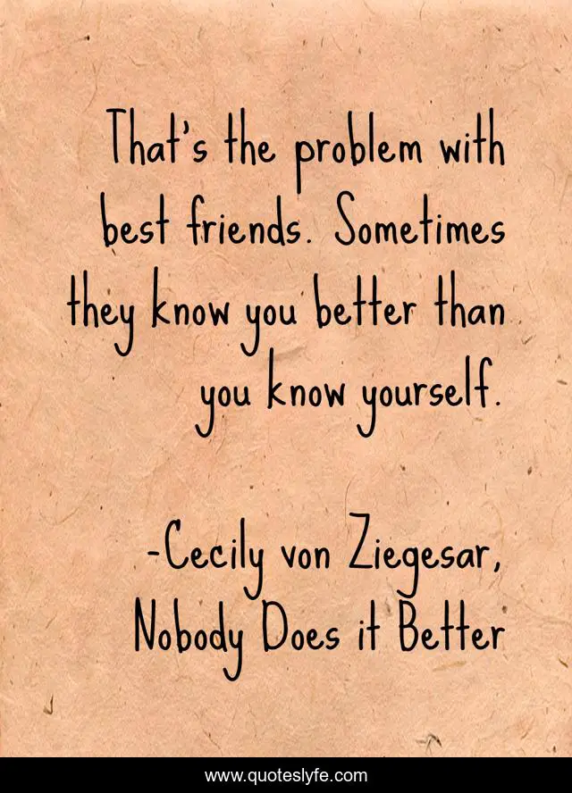 "Cecily von Ziegesar, Nobody Does it Better Quotes." Quoteslyfe.com, 2025. Fri. 05 Dec. 2025. <https://www.quoteslyfe.com/quote/That-s-the-problem-with-best-friends-22123>.