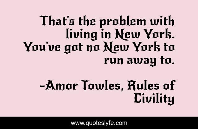 This page presents the quote "That's the problem with living in New York. You've got no New York to run away to.". Author of this quote is Amor Towles, Rules of Civility. .