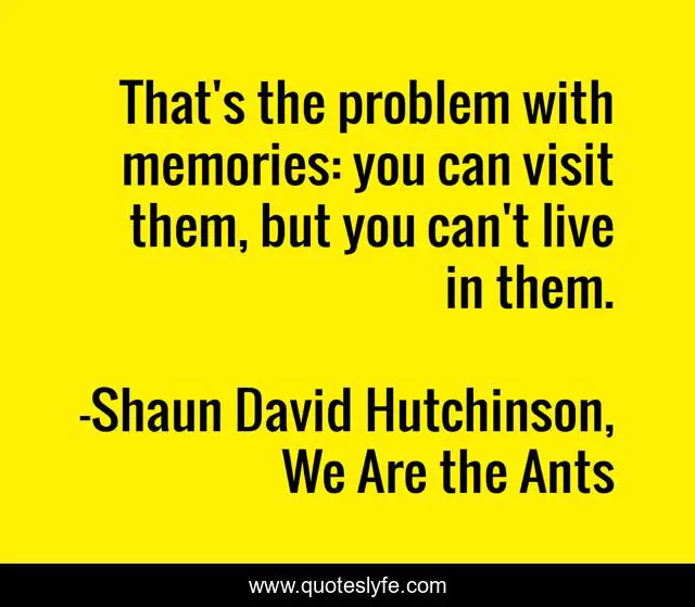 This page presents the quote "That's the problem with memories: you can visit them, but you can't live in them.". Author of this quote is Shaun David Hutchinson, We Are the Ants. This quote is about memories, life, we-are-the-ants,.