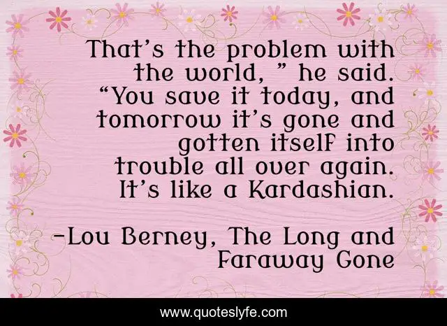 This page presents the quote "That’s the problem with the world, ” he said. “You save it today, and tomorrow it’s gone and gotten itself into trouble all over again. It’s like a Kardashian.". Author of this quote is Lou Berney, The Long and Faraway Gone. This quote is about kardashian, world, problems,.